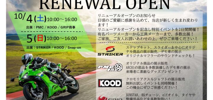 秋風が心地良い季節となり、木々が色づき始め済んだ空気の中を走れるツーリングに最適な日和がやってきます10月。イベント開催も盛りがってきています。STRIKER更にイベントを盛り上られますように出展して...
